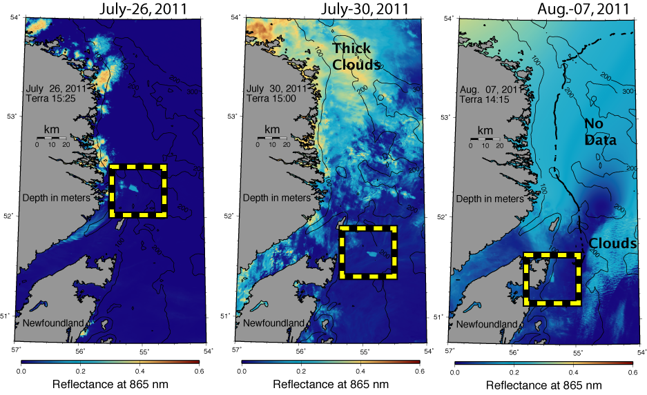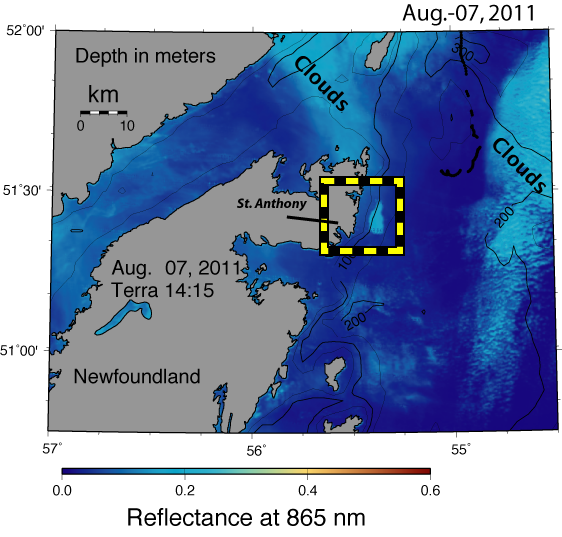 The Petermann Ice Island PII-A is within 5 km (3 miles) from the shores off St. Anthony, Newfoundland. The MODIS Terra image of this morning shows PII-A sitting in water 100 meters (330 feet) deep. The island may be partially grounded, because its thickness is close to the water depth.