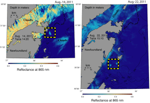 Petermann Ice Island PII-A as seen by MODIS/Terra as one piece on Aug.-14, 2011 and as two pieces on Aug.-22, 2011 (click to enlarge).