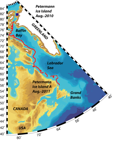 Track of Petermann Ice Island from Aug.-2010 through Aug.-2011 traveling in shallow water from northern Greenland along Baffin Island and Labrador to Newfoundland.