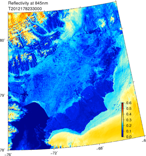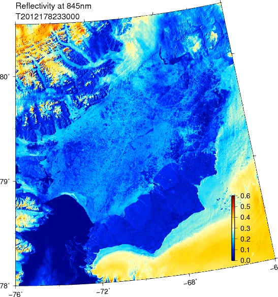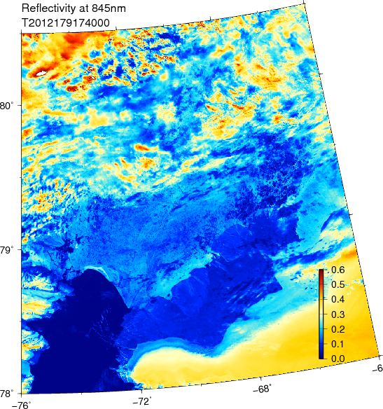 MODIS-Terra June-27, 2012 at the onset of collapse. Note the change near the Canada at 79 N latitude where open waters meets the sea ice.