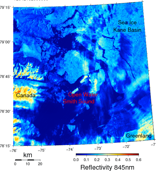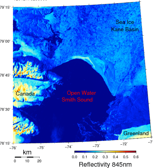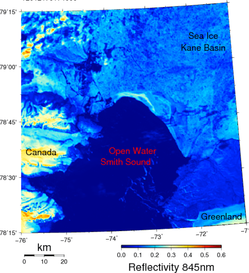 Ice-Bridge at southern Nares Strait on June-27, 2012 17:40 UTC from MODIS-Terra. Notice the crack and hairline fractures in the ice along the Ellesmere Island coast near 79 N latitude and 75 W longitude.