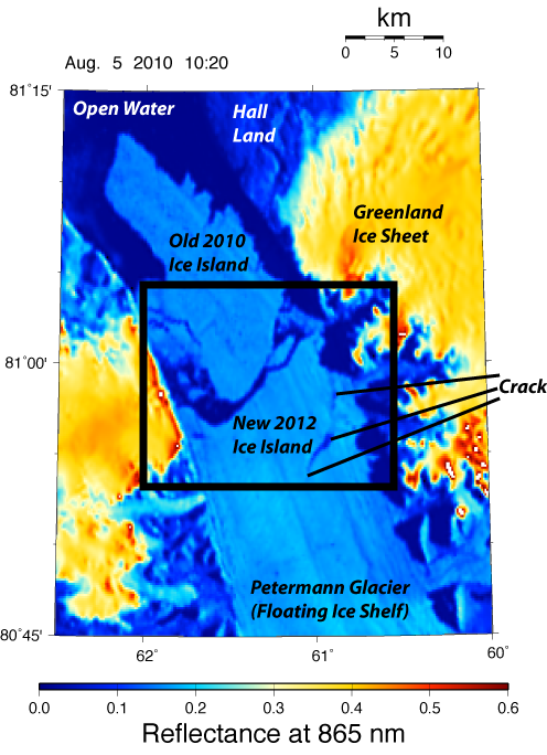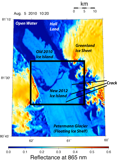 The 2010 Petermann Glacier calving event also indicates the crack that broke off this morning as indicated. Note that the entire floating ice shelf moves by about 1 to 1.3 km per year, slightly less than a mile per year. The crack in 2010 is where the 2012 ice island formed.