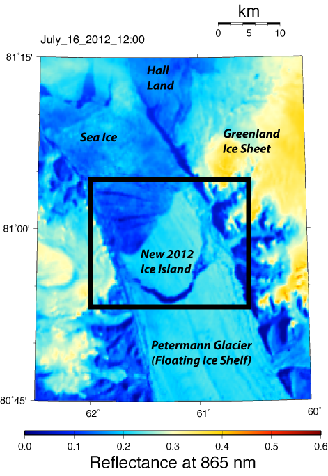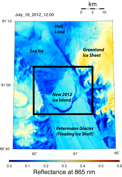 MODIS-Aqua image of July 16, 12:00 UTC of a new ice island forming from Petermann Glacier.