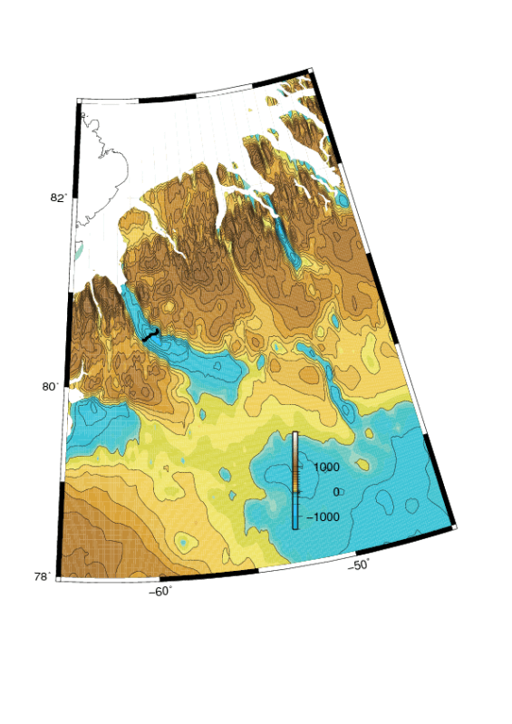 Same as above Bamber et al (2003) bedrock map, but for smaller area showing Petermann Glacier hinge-line.