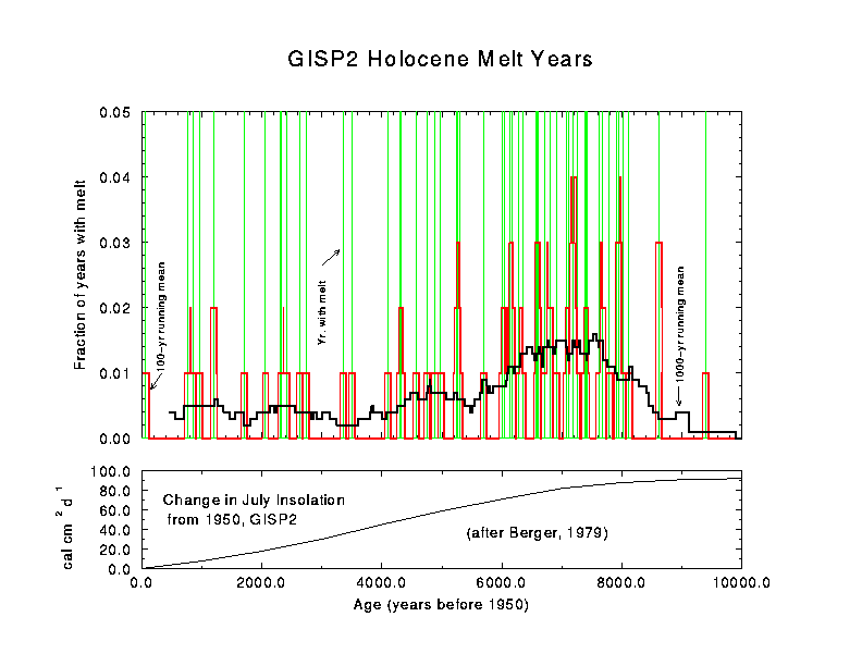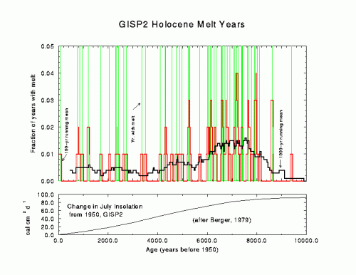 Basically this graph says that, averaged over the last 4000 or so, the snow melts once every 250 years at the GISP2 site. The graph also shows, that the incoming sun light (solar insulation) in July has actually decreased from 4000 years ago to today (Berger, 1979)./UPDATE