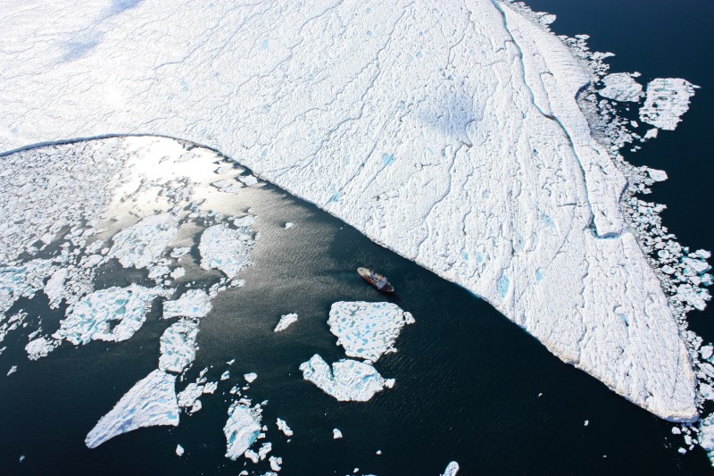 CCGS Henry Larsen adjacent to the Petermann Ice Island PII-2012 on Aug.-10, 2012. The south-western tip of PII-2012 at the bottom right of the image was used by Captain Wayne Duffett as a reference point for the motion of PII-2012. The exact position of this point was monitored at hourly intervals via helicopter while the ship was operating inside the fjord landward of the ice island. [Photo Credit: Canadian Coast Guard Ship Henry Larsen/Jo Poole]