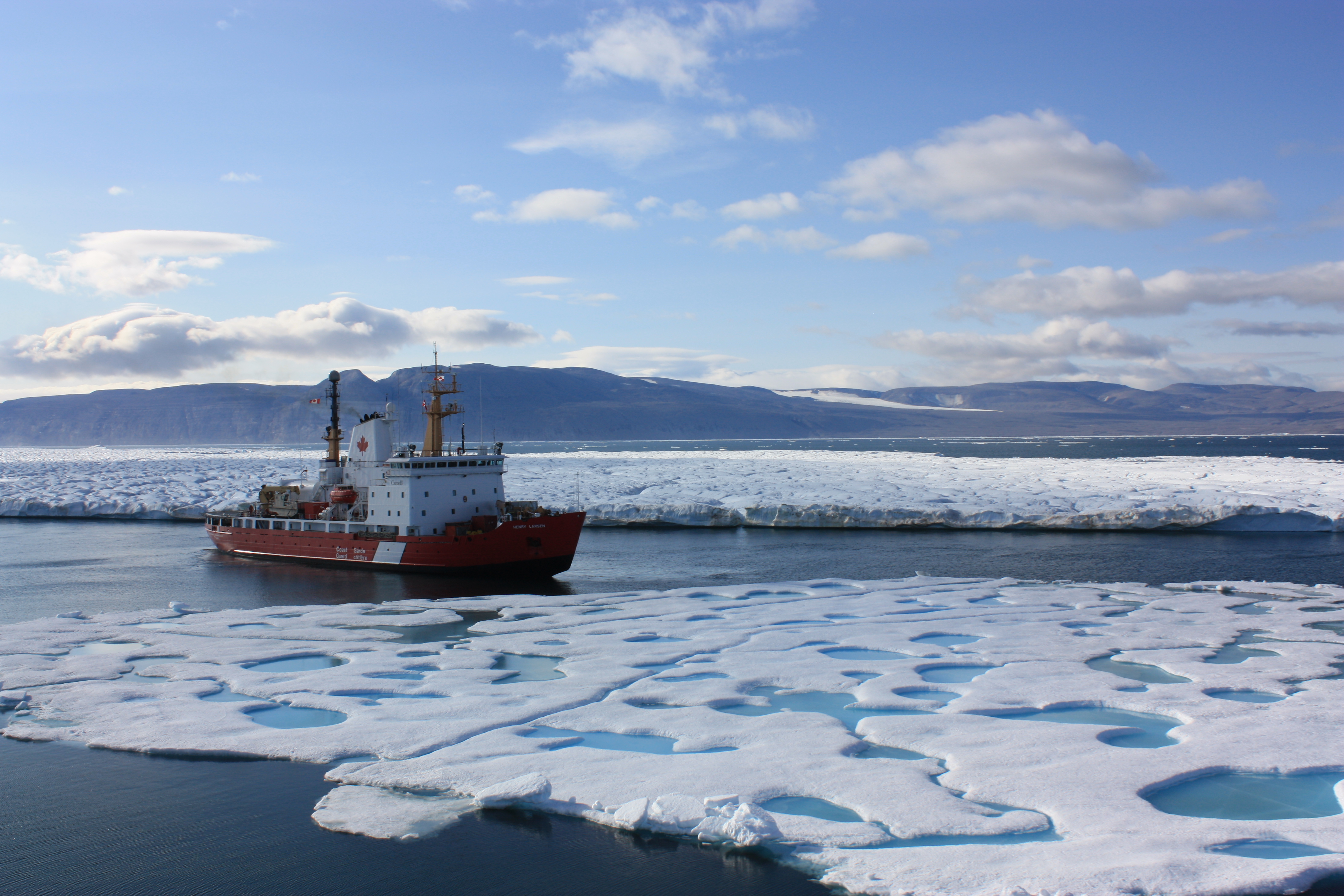 Canadian Coast Guard Ship Henry Larsen at the entrance to Petermann Fjord on Aug.-10, 2012. The ice island PII-2012 is in the background with puddles on sea ice in the foreground. Polaris Bay, Greenland is in the far back. [Photo Credit: CCGS Henry Larsen and Jo Poole.]
