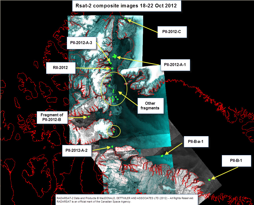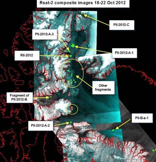 Ice island from 2010 and 2012 calvings litter Nares Strait and northern Baffin Island, Canada. All these glacier fragments originate from Petermann and Ryder Gletscher in north-west Greenland. The image below is a composite that Luc Desjardins of the Canadian Ice Service compiled from RadarSat imagery. He painstakingly identified 25 segments in these imagery.