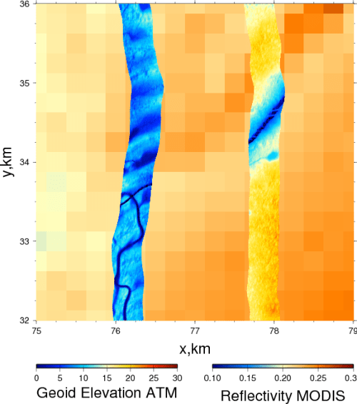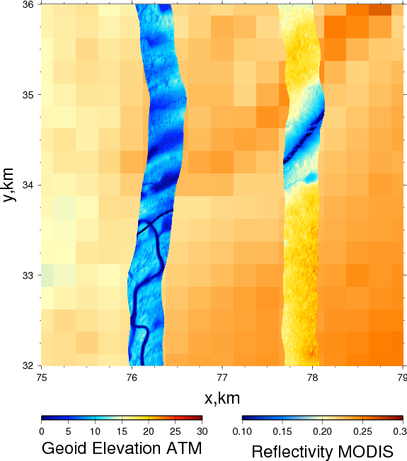 Petermann Glacier surface elevation from laser shots on Mar.-24, 2010 at the site where the Manhattan-sized ice island formed Aug.-6, 2010. The background shows the same scene at the same time at 250-m resolution from MODIS (see below). Colors along the 350-m wide laser track line show height above sea level in meters.