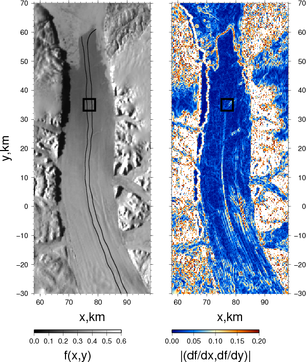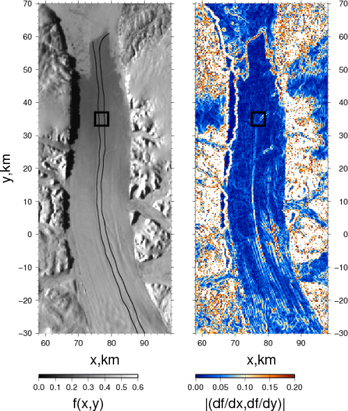 Petermann Glacier on March 24, 2010 as seen from MODIS satellite at 250-m resolution with two flight tracks along which laser data are collected. The black box shows the site of the figure above. The color figure on the right shows the slope or gradients of the data shown on left. It emphasizes regions where brightness changes fast. Multivariate calculus is useful!