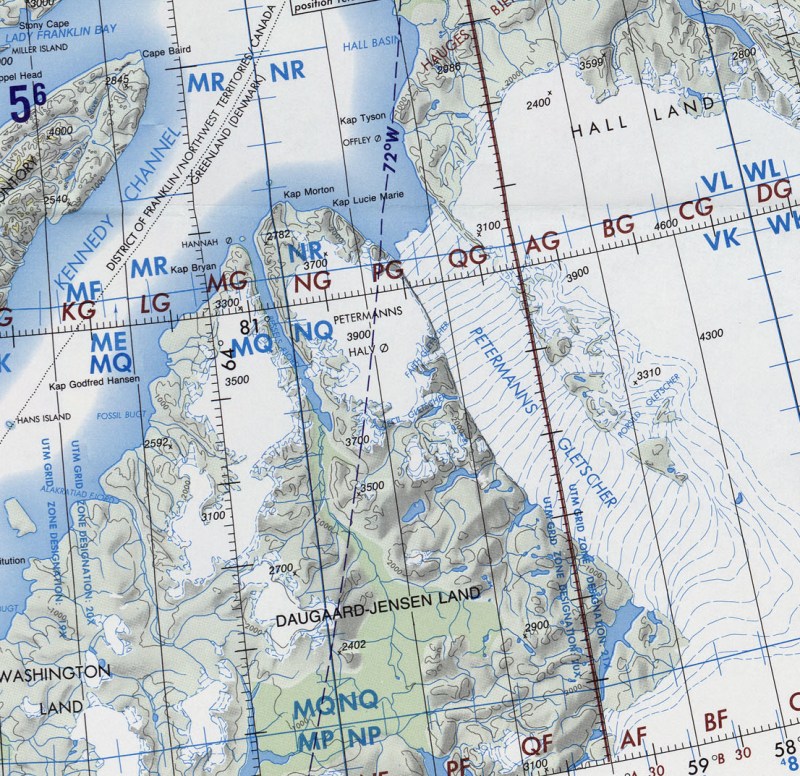 Petermann Gletscher and suroundings extracted from U.S. Defense Mapping Agency Chart ONC A5 (January 1991).