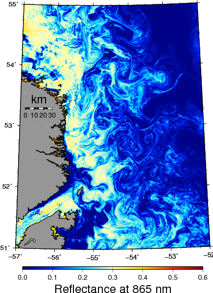 The Labrador Shelf Current off Canada moves ice, icebergs, and ice islands from the Arctic down the coast into the Atlantic Ocean. To the naked eye the ice is white while the ocean is blue. Our eyes in the sky on NASA satellites sense the amount of light and color that ice and ocean when hit by sun or moon light reflects back to space. An image from last friday gives a sense of the violence and motion when this icy south-eastward flowing current off Labrador is opposed by a short wind-burst in the opposite direction: