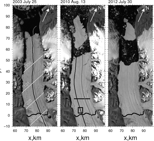 Petermann Gletscher from MODIS Terra. Repeat NASA along-glacier flight tracks are shown in the left and middle panels. White line across the glacier are ICESat tracks. Thick black line across the glacier near y = 0 km is the grounding line location from Rignot and Steffen (2008). Dark areas within 2 km off the western wall are mountain shadows.
