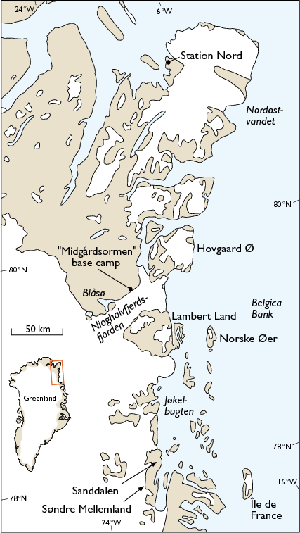 Map of North-East Greenland [From: Bennike and Weidick, 1999, Geology of Greenland Survey Bulletin, 183, 57-60.]