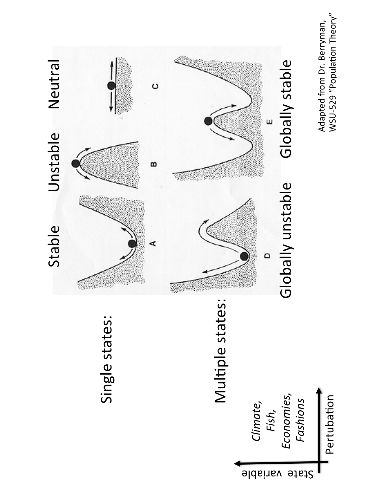 Now these are all useful contexts, but nature usually has more than a single state and the second row tries to visualize this with two possible states. Both entries have stable solutions, think of a valley as a stable state that responds to change without going over the hill. Once over the hill (the threshold or tipping point), one enters another stable state that may be different, that is, the number of herrings present are smaller or the globally averaged temperature is higher, or iPhone usage is larger than it was before. Going over the hill requires a large change to enter another valley. It is very hard to get out of this other valley as it requires another large change that may not happen for a long time. This is how I think about climate, too, or fisheries. We can stress and change it a lot, but once we cross the hill, we are in a new domain, a new world, that is hard to escape from. Herrings took a beating for 10 years (lots of fish), but once crashed, the new equilibrium (few fish) destroyed the livelihood of many families.