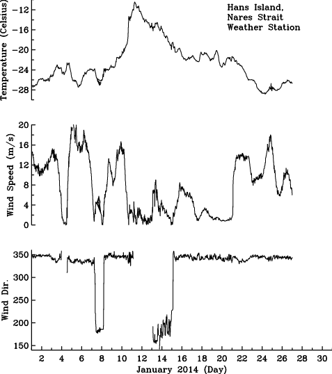 Weather record from Hans Island at the center of Nares Strait for January 2014. [Data from Scottish Marine Institute in Oban, Scotland.