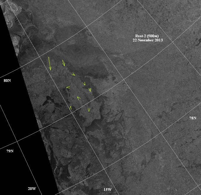 Radar data from satellite on Nov.-22, 2013 off north-east Greenland with a few