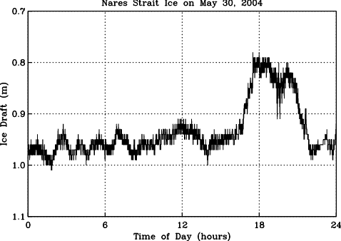 The ice here is a little thicker, but not by much. What stands out are three funky looking, abrupt jumps every 6 hours precisely. How can this be? Well, it cannot and I must have done something bad to the data. Recall that we need speed of sound and water density estimates to convert acoustic travel time to ice draft. On April 18, 2005 my estimates perhaps were off. But why? And how can this be fixed?