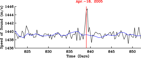 Vertically averaged sound speed for the month of April 2005. Black curve is for 6-hourly and blue curve is for 24-hourly estimates.