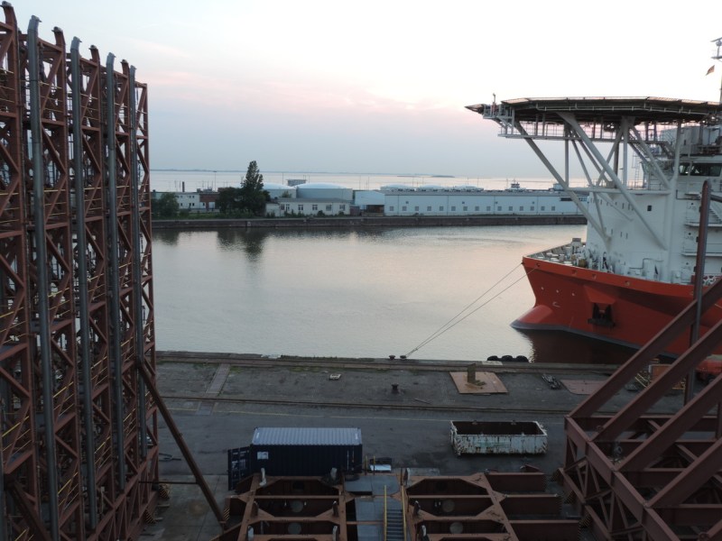 View across the harbor from the C-deck of FS Poalrstern in dry dock in Bremerhaven.