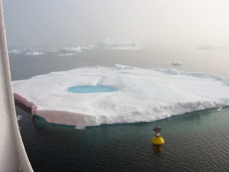 Acoustic Doppler Current Profiler returning to the surface after a 3-year deployment in Nares Strait.