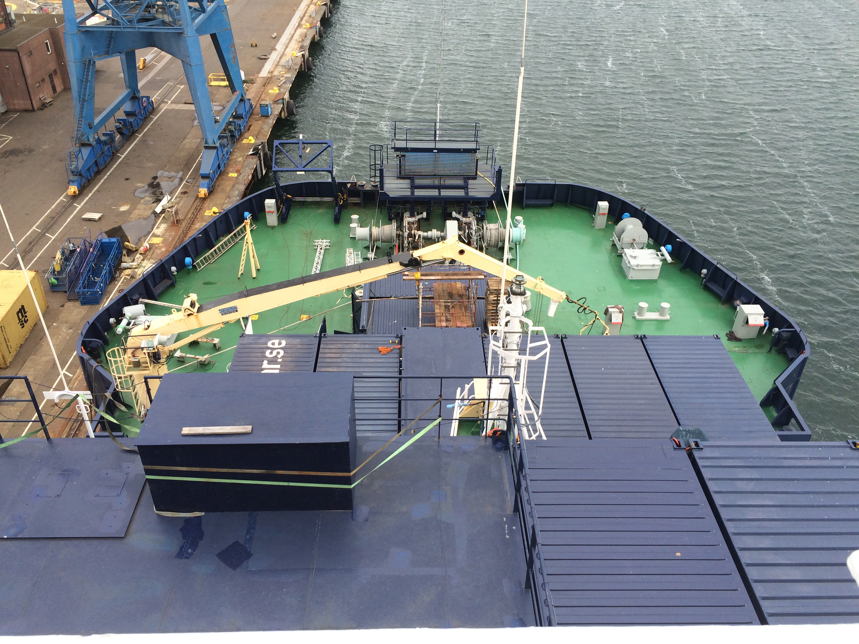 Forward deck of I/B Oden from which the water sampling equipment and electronic sensing will be deployed.