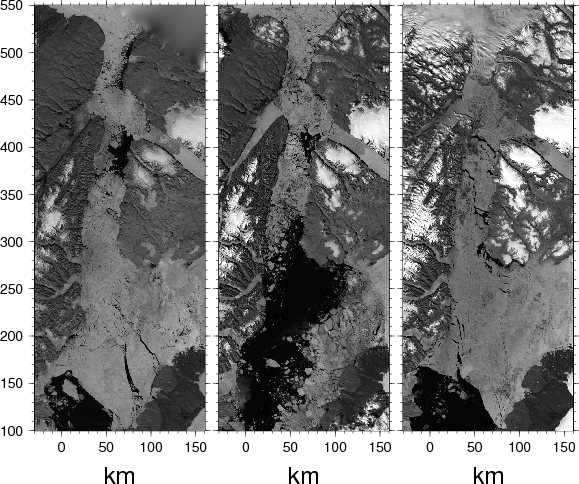 Nares Strait ice cover in July of 2013, 2014, and 2015 from MODIS Terra.