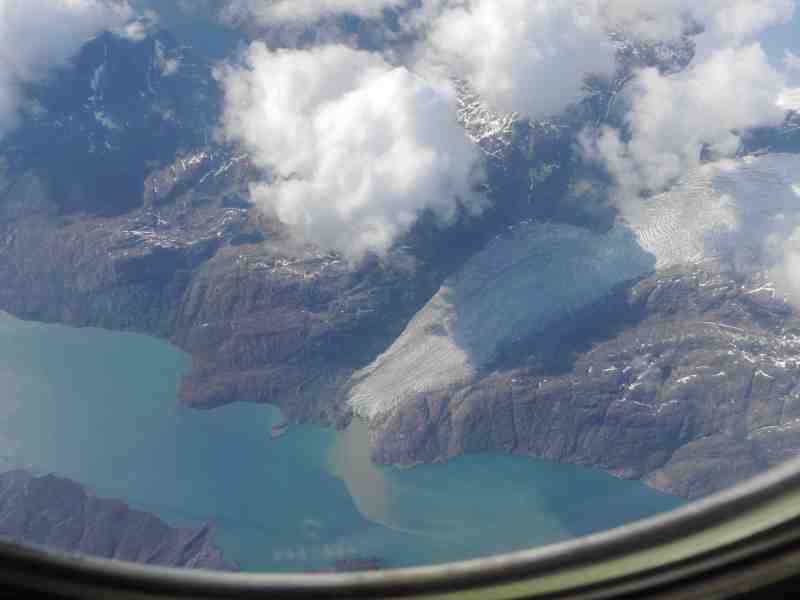 Small Greenland glacier discharging a sediment plume at its grounding line into a fjord.