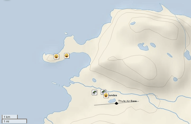 Geocaching map of Thule AFB, North Mountain, and Dundas Mountain. Smiley faces indicate that I found and opened the hidden treasures.