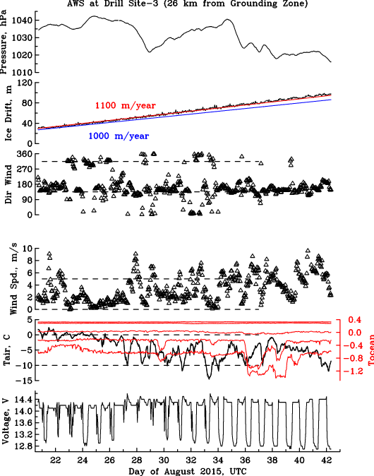 Measurements from the ocean weather station up until 2015-Sept.-11 as a function of time where Day-20 is Aug.-20 and Day-32 is Sept.-1. The station provides battery voltage (bottom panel), air and ocean temperatures, wind speed and direction, ice drift from GPS, and atmospheric pressure (top panel).