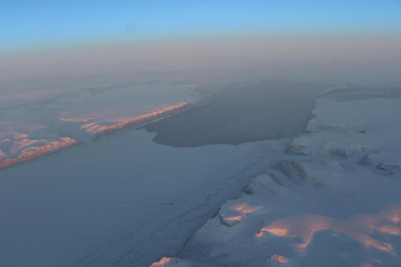 Petermann Gletscher at dawn on 5 Oct. 2015 as captured by NASA Operation IceBridge. Our Ocean Weather Station is in the corner bottom left.