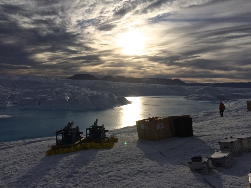 Midnight sun at ice drilling camp on Petermann Gletscher 20 August 2015. Notice central channel. [Credit: Peter Washam]