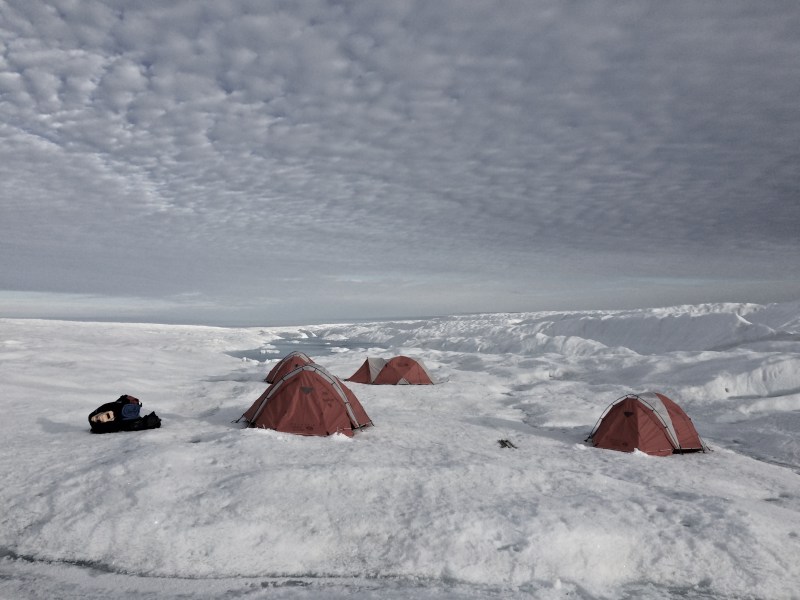 Camping site of the ice drilling team on Petermann Gletscher in August 2015 during installation of the Ocean Weather Station. [Credit: Peter Washam]