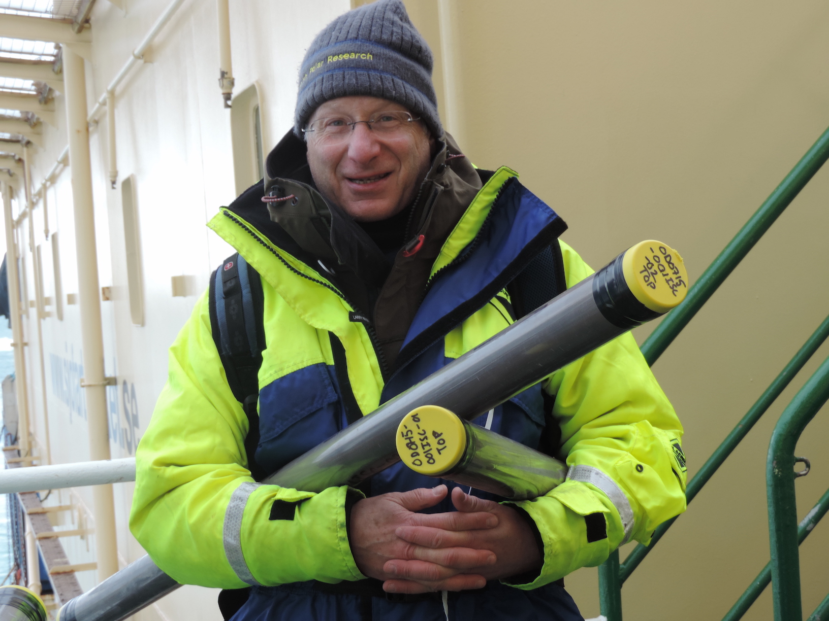 Dr. Larry Mayer carrying sediment cores recovered from below Petermann Gletscher from the helicopter deck to the laboratory aboard I?B Oden in Aug.-2015.