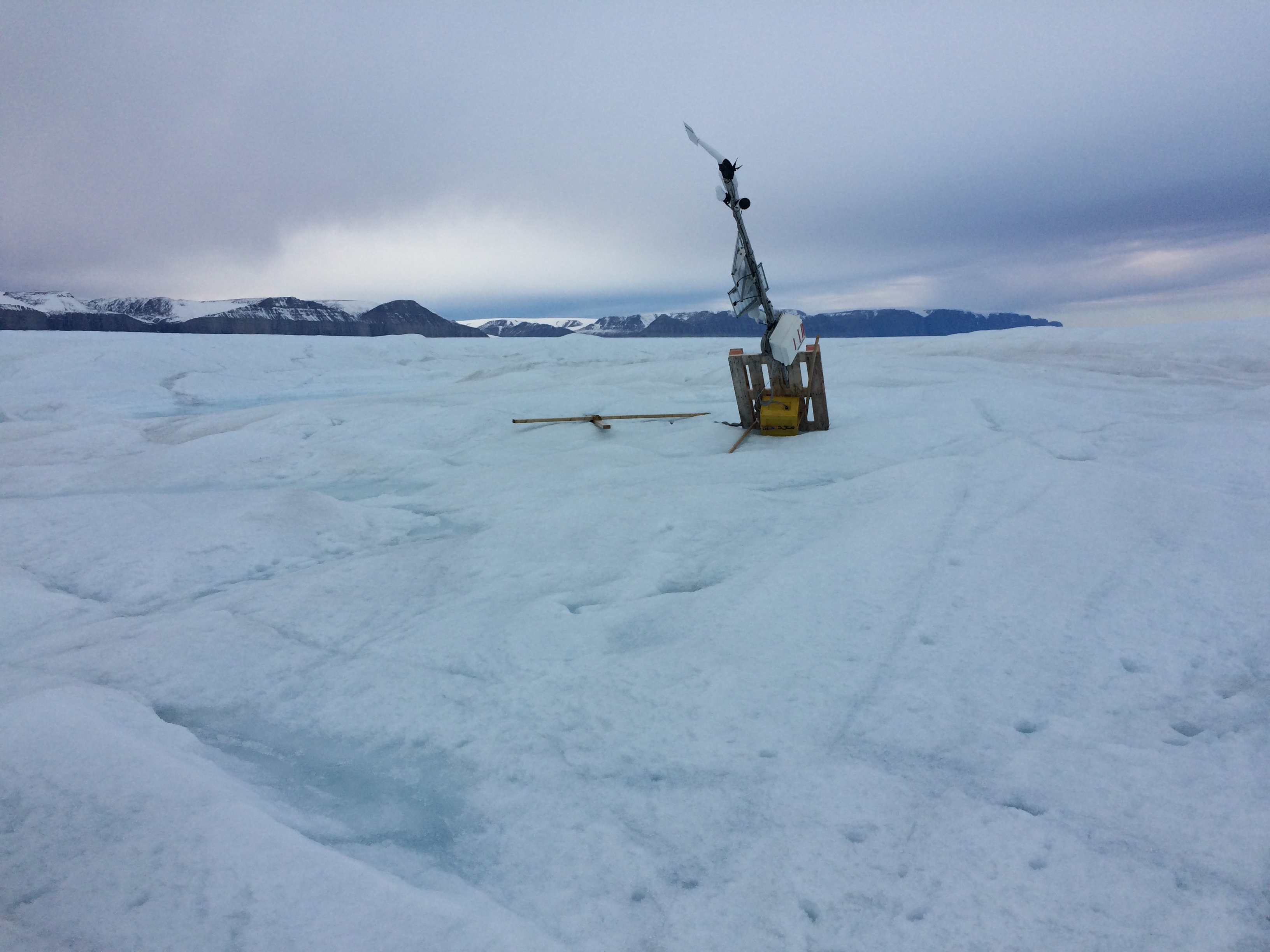 University of Delaware weather station on Petermann Gletscher on 27 August 2016. View is to the north-east towards the Greenland ice Sheet, that is, the glacier flows from right to left.
