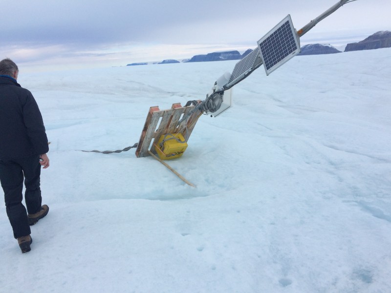 Bottom section of the University of Delaware weather station on Petermann Gletscher on 27 August 2016. View is to the north-west towards Nares Strait. The palette designed to stabilize the station as the glacier melts under it is turned and rests on the 80 lbs yellow battery box that was strapped to the surface of the palette.