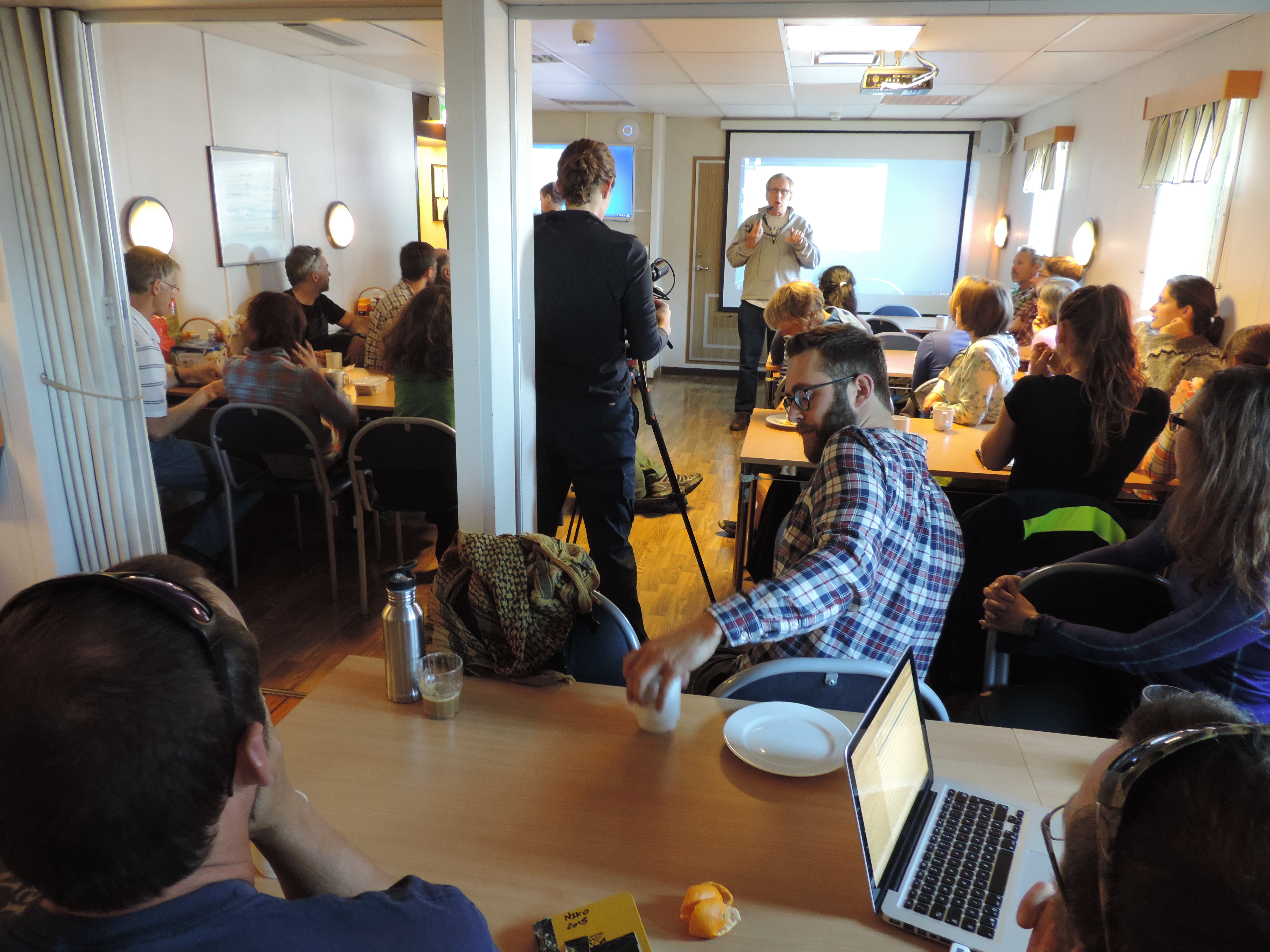 Chief Scientist Alan Mix briefing the science party aboard I/B Oden in July 2015 during transit to Petermann Fjord.