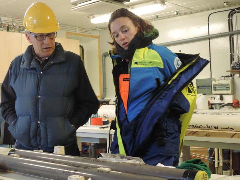 Alan Mix and Kelly Hogan with sediment cores recovered from ocean sediments below Petermann Glacier on 9. August 2015.