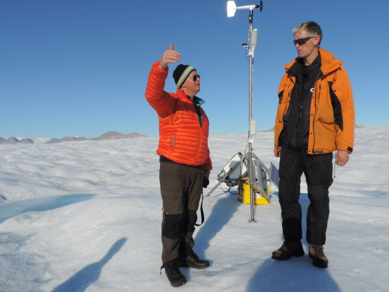 Keith Nichols (right) with helicopter pilot Johan Baalack on 10 Aug. 2015 after a test deployment of the weather station on Petermann Glacier.