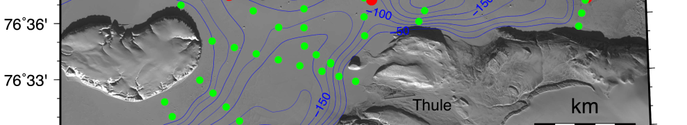 Satellite image of ice-covered Wolstenholme Fjord, Greenland with water column profiling station (green dots) and acoustic modems (red dots). Blue lines are water depths in meters. Labels G1, G2, and G3 indicate three tide-water glaciers while Thule refers to Thule Air Base. Saunders Island is near the center left while the weather station is the red dot halfway between Saunders and Manson Islands.