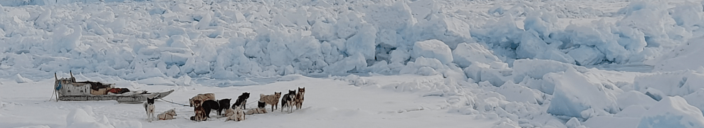 Steffen’s photo shows his study area, research platform, and mode of transportation. There is a glacier in the background between the rocks on the left (north) and unseen mountains to the right (south). Equally unseen is the ocean under all this crushed and broken and piled up sea ice covered by fresh snow. We see tracks of people walking to the vantage point from where the photo is taken. The dogs rest on a small patch of level sea ice perhaps 3-5 feet (1 to 1.5 meters) thick.