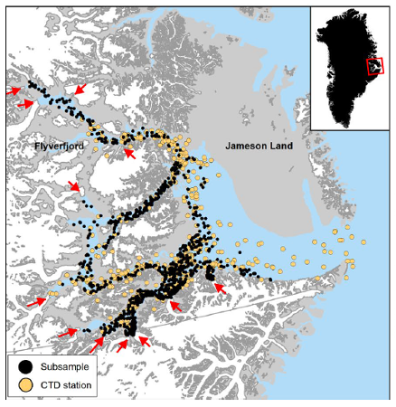 Data collected during a study on temperature-dependent habitat selection for narwhals displays 10 locations per day of 12 narwhals in Scoresby Sound in Greenland for a total of 1,000 positions (Heide-Jørgensen et al., 2020). The narwhals were tracked using satellite-linked time-depth recorders. The mapped positions of the narwhals (black dots) are more concentrated away from the mouth of the fjord complex where Atlantic water enters. Instead, they gather in tributaries on the western side of the fjord where there are active glaciers (red arrows).