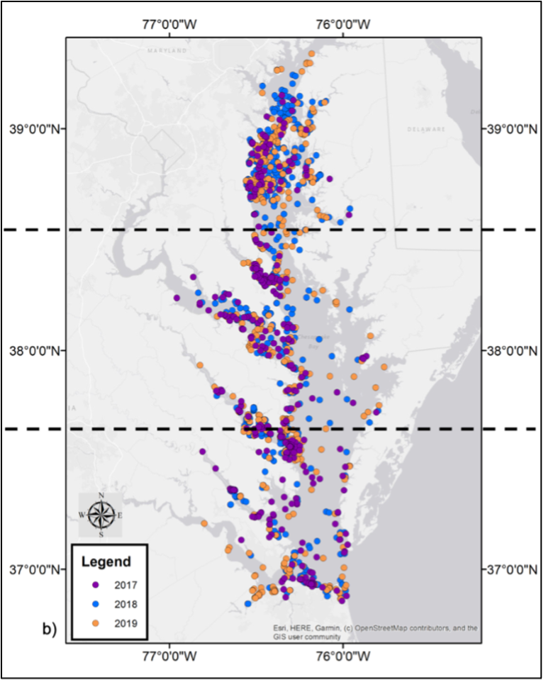 The University of Maryland’s Chesapeake Dolphin Watch program (https://www.umces.edu/dolphinwatch) maps citizen dolphin sightings throughout the Chesapeake Bay. Figure 2 below displays the locations of dolphin sightings in 2017 (purple dots), 2018 (blue dots), and 2019 (orange dots). The figure also divides the bay into the upper bay, middle bay, and lower bay, with the lower bay closest to the Atlantic Ocean (Rodriguez et al., 2021). Within these divides, the majority of dolphin sightings are recorded in the upper bay, and overall more dolphins were sighted on the western side of the bay. The dolphin sighting distribution in the Chesapeake Bay in 2017-2019 resembles narwhal distribution in Scoresby Sound, Greenland. Both dolphins and narwhals appear to be found away from the mouth and instead in the tributaries.