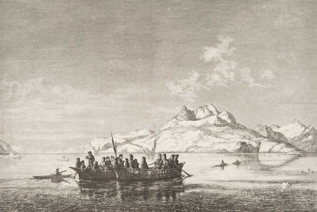 Umiak in Greenland as depicted by Carl Rasmussen in 1875 adapted from https://en.wikipedia.org/wiki/Umiak