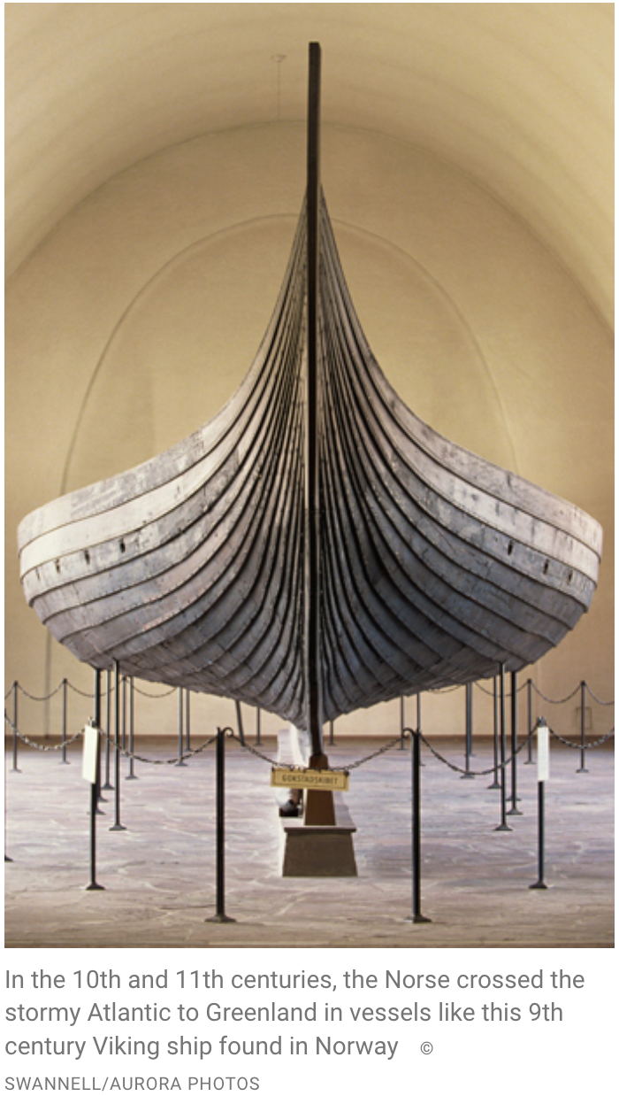 While Viking rulers of Kyiv in Ukraine formally converted to Christianity in 988 CE at the outer limits of eastern Europe, two small viking settlements emerged at the southern tip of Greenland close to the Americas. The Norse settlers of Greenland left Iceland with 25 ships, but 11 of these either turned back to Iceland or were lost at sea. The remaining 14 boats arrived near 61 N latitude to establish an “Eastern” settlement which over time grew to more than 190 farms and 12 churches. Farther north near 64 N latitude a smaller “Western” settlement eventually grew to about 90 farms and four churches near Nuuk, today’s capital of Greenland. The “Western” settlement had a warmer and milder continental climate, because their farms were located far inland within a wide and complex fjord system that sheltered the farmers from atrocious coastal storms. The “Eastern” settlement was hit harder by these storms, because here the farms were closer to shore, closer to the icesheet, and closer to the center of the North-Atlantic storm activity.