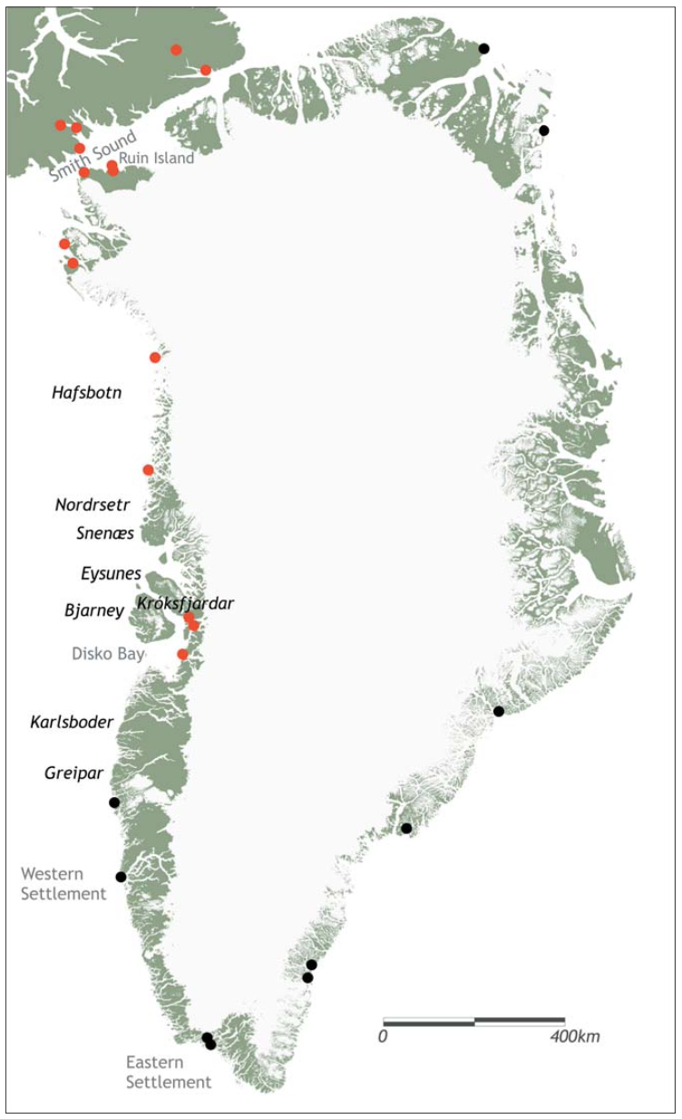 Map of Greenland and Ellesmere Islands adapted from Gullov (2008). Red symbols indicate Norse artifacts found at Inuit sites occupied in the 13th and 14th century while black dots represent location of such artifacts at 15th and 16th century.
