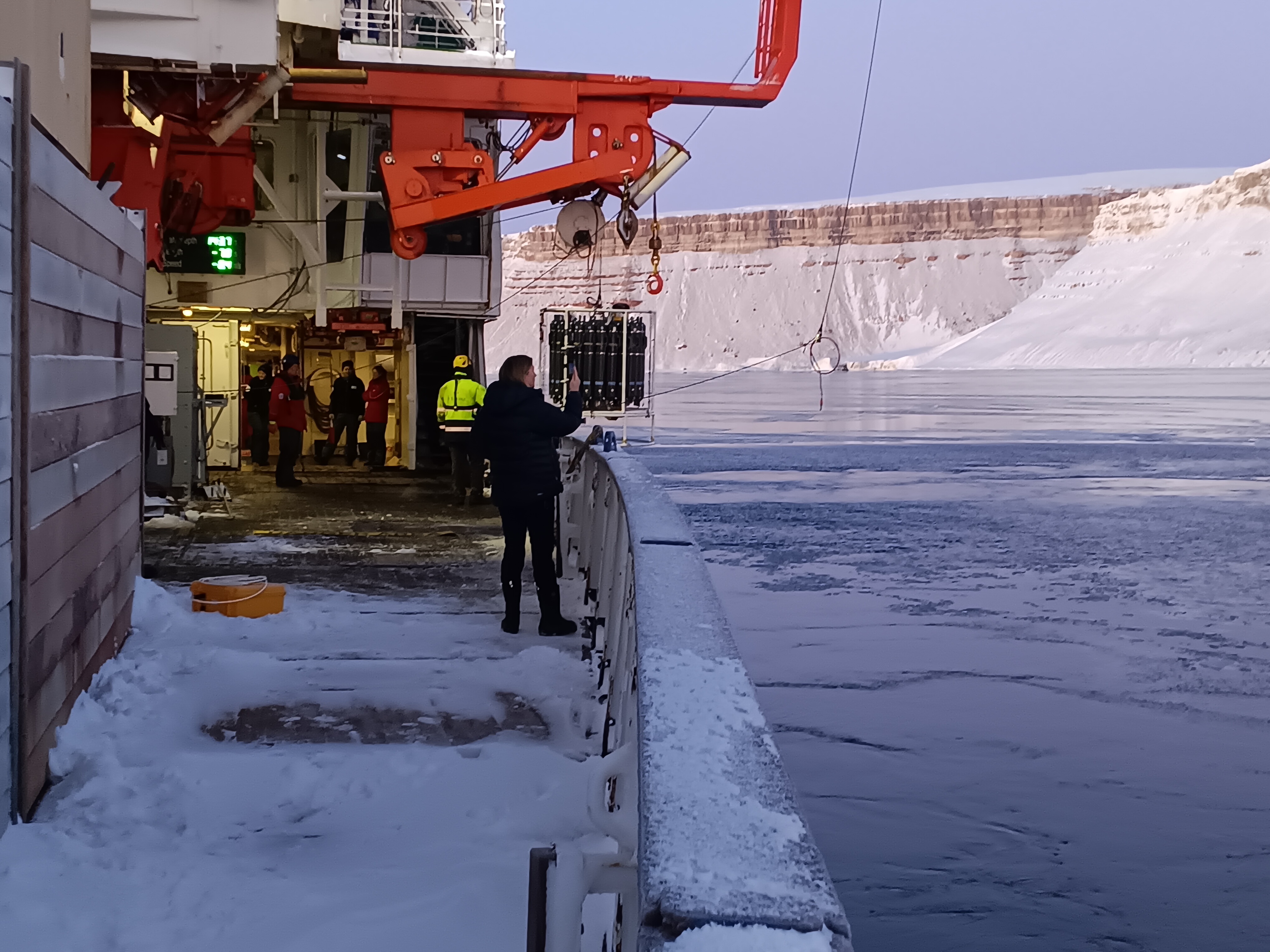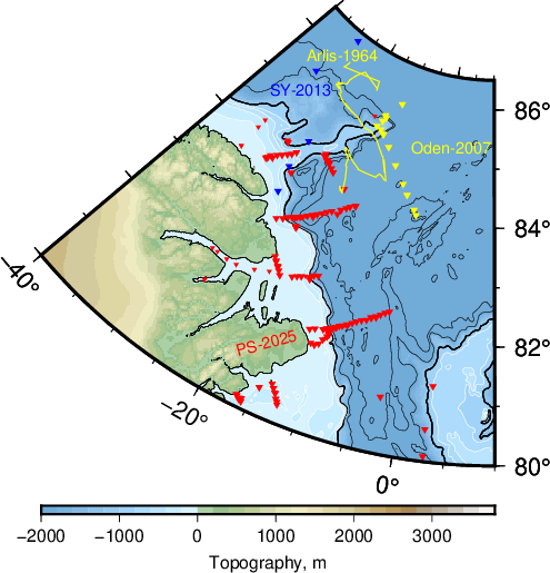 The map above shows where we went to the north of Greenland. I am coloring the coastal ocean shallower than 1000 m in light blue and the deeper ocean in dark blue. Our 2025 Polarstern data are the red symbols while yellow and blue symbols show data locations from 1964 ice island, 2007 icebreaker,  and 2013 helicopter surveys. This area contains the last and thickest sea ice of the Arctic Ocean and prior ocean observations originate from floating ice islands that both the Soviet Union and the U.S.A. used during the Cold War 1947-91 such as the Arlis-1964 track (yellow line). Helicopter surveys collected a few data in 2013 (blue symbols) while the Swedish icebreaker Oden collected data along two lines farther offshore (yellow symbols).