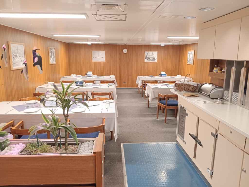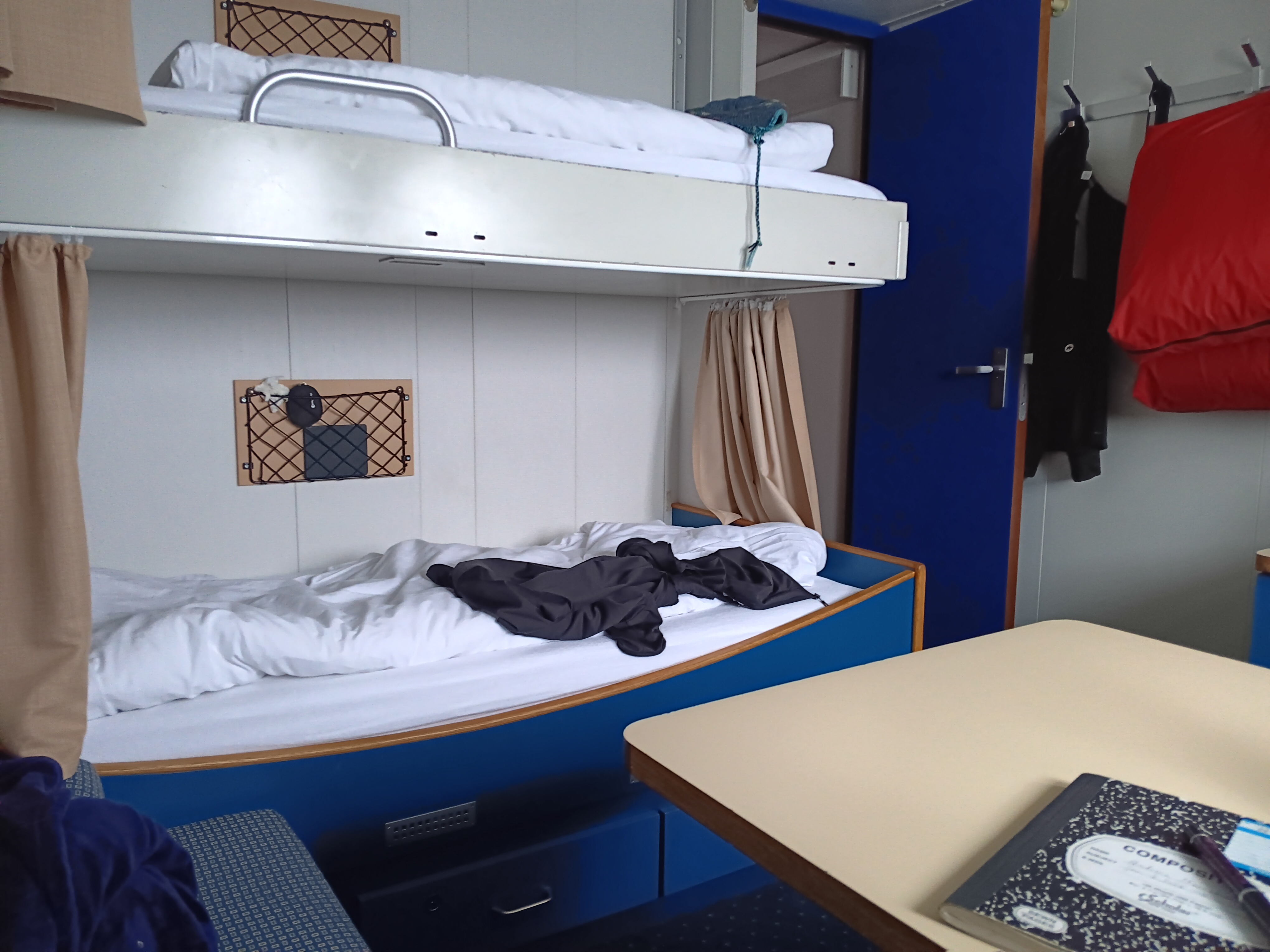 Now how does Greenland look from the ship? Well, there is always ice and it is always cold. The coldest days we had near the coast when the skies were clear. The coldest day we had -20 C, that is -4 F for my American friends, but most of the time we had clouds and storms with temperatures warmer at -12 C (10 F) with clouds and little visibility. It snowed alot and shoveling the ship’s deck was an almost daily chore. A relaxing “cruise” it was not. We worked sensors systems in the windy cold outside during all hours of the day and night. Pictures like the above were almost always taken during my 8 hours “off” that for me was from 08:00 to 16:00, because my shift was from 16:00 to 24:00. After a phone call to my wife after midnight and a peppermint tea to warm up, I slept from 01:00 to breakfast at 07:30. As almost all scientists aboard I shared my cabin with others, so there is not too much privacy. The photos below show my bunk bed (I slept atop), shared work spaces, and the rarely empty dining room. We often ate in shifts, too, because not all 50 people would fit the dining room in one sitting. So we often had 2 sittings. A comfortable living room was next door for desert, tea, coffee, games, and conversations.