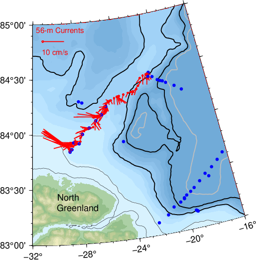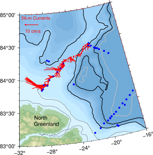 The map on the left shows our study area to the north of North Greenland. On it in red are sticks whose length indicate the speed or strength of the ocean current (at 56 meters below the surface) while its orientation gives the direction of the current. The light blue is shallow and dark blue is deep water as before. The current is sluggish offshore with a weak component to the south. In contrast, closest to the coast of North Greenland we find long sticks that point to towards the left (west by north-west). This is Claudia’s Coastal Current.