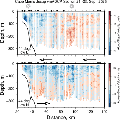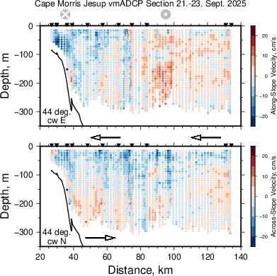 Now what about science, you may ask. Here we made a major discovery, I felt. A mathematician used her craft to predict a coastal current to the north of Greenland that, I admit, made no sense to me as it contradicted 30+ years of training and intuition in which direction such currents would flow, that is, the coast should be on the right hand side looking in the direction of the flow. The curious thing was that to the north of Greenland it should go in the opposite direction, that is, with the coast on the left. In Claudia’s numerical computer model run for months on super computers, this current-in-the-wrong-direction was a both prominent and persistent feature. I always discarded it as an unrealistic feature of some computer code run amok. And yet, when we actually reach the coast of northern Greenland and I measure ocean currents from a ship sensor that runs 24/7 to tell me current speed and direction, here this weired or “wrong” current was. It screamed at me from the screen the moment I plotted the data and shared it with Claudia who was aboard with the comment: “Your model is right and my intuition was wrong. Your current is at the same location, the same speed, and in the same direction as your model said it would.” Furthermore, a distinct and separate way to estimate ocean currents from ocean temperature and salinity observations showed the exact same thing. That’s now two good complementary confirmation of the current that nobody has ever seen or measured … until now that we aboard Polarstern did so on Sept.-23, 2025: